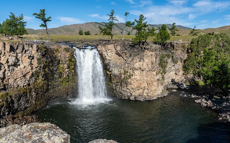 A dramatic 20-meter cascade in volcanic basalt cliffs — one of Mongolia’s most scenic waterfalls.